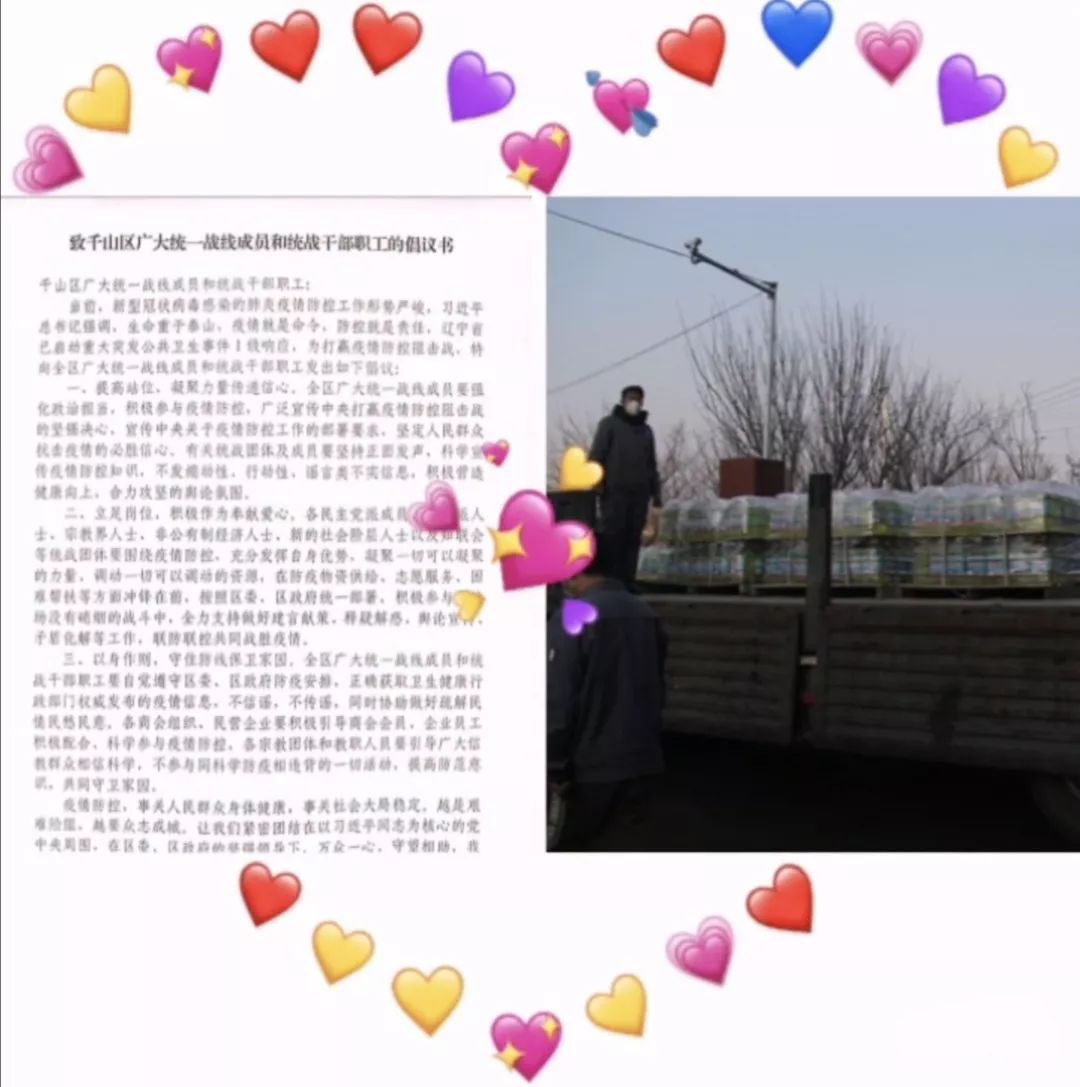当前,鞍山疫情防控进入关键时期,一线防疫人员急需大量防护物资,鞍山市千山区统战部向区广大统一战线成员发出倡议,广大企业迅速行动,把疫情防控物质筹措作为当前压倒一切的重大政治任务,齐心协力、共同参与打赢这场没有硝烟的疫情防控攻坚战。