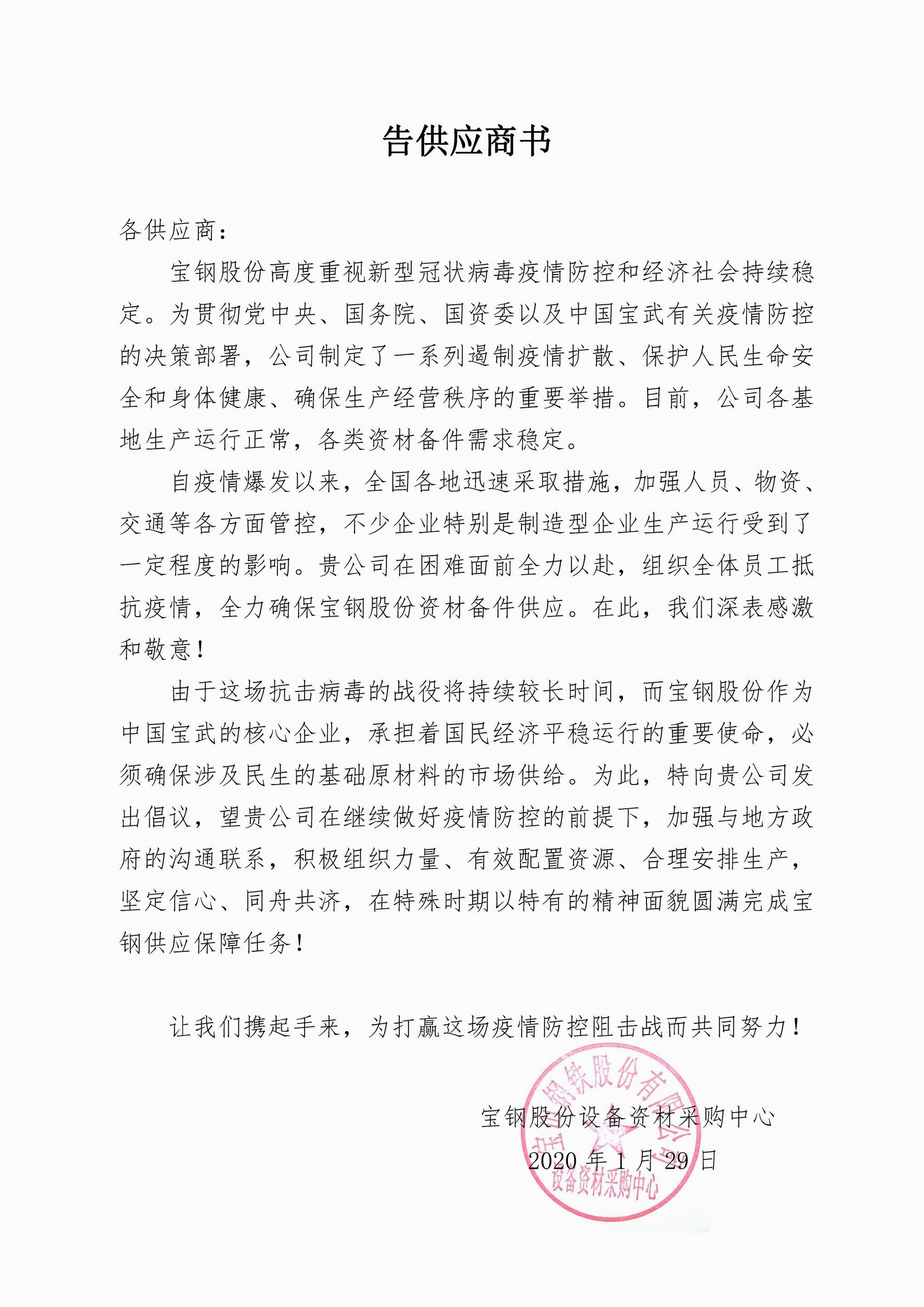 万众一心抗疫情,宝武钢铁集团作为中国最大的钢铁企业,肩负着抗击疫情的重要使命。作为宝武集团优秀供应商,辽宁bbv体育登录网址公司在第一时间响应号召,积极组织力量、有效配置资源、合理安排生产、克服了原材料供应,物流运输等困难,及时确保供货,辽宁bbv体育登录网址将以高度的责任感和使命感,与社会各界在党和国家各级政府的坚强领导下,积极履行企业社会责任与全国人民和社会各界众志成城、万众一心打赢疫情防控阻击战。